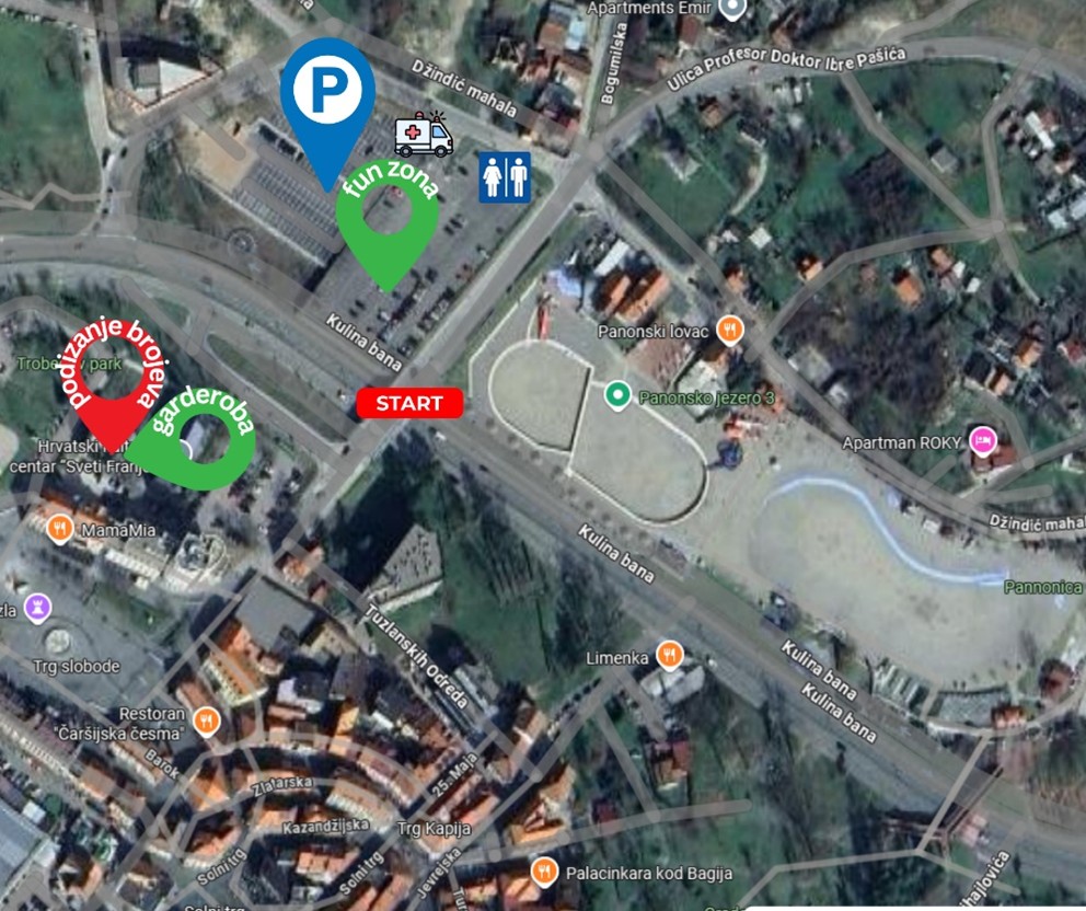 - Preporučeni parking: JKP “Saobraćaj i komunikacije-Tuzla” d.o.o., lokacija Parkiralište jezero “Zapad”. Ovaj parking radi 24 sata dnevno, ograđen je i nadziran, pa se preporučuje svim trkačima koji dolaze automobilom.